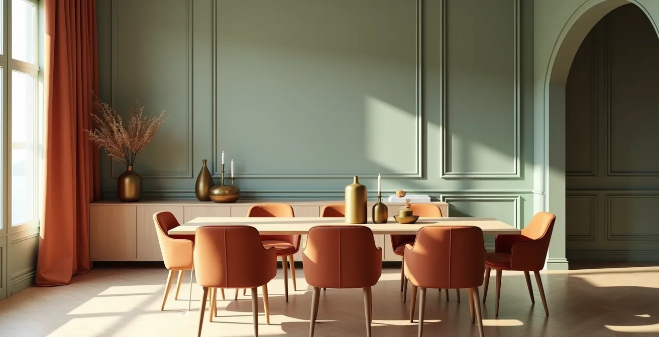 Le terracotta, avec ses nuances chaudes d’argile et de terre cuite, est synonyme de convivialité, de chaleur et d’artisanat. Il évoque les paysages méditerranéens et a la particularité de stimuler l’appétit, ce qui en fait un excellent choix pour une salle à manger. Il se marie à merveille avec des tons neutres comme le beige et le crème, mais aussi avec des couleurs plus profondes comme le bleu nuit. Le vert sauge, quant à lui, est une couleur apaisante et sereine. Il évoque la nature, la fraîcheur et le calme. C’est un choix parfait si vous souhaitez que votre salle à manger soit aussi un lieu de détente. Il s’associe magnifiquement avec le blanc, les bois clairs, le laiton et même… le terracotta, pour un duo très tendance.