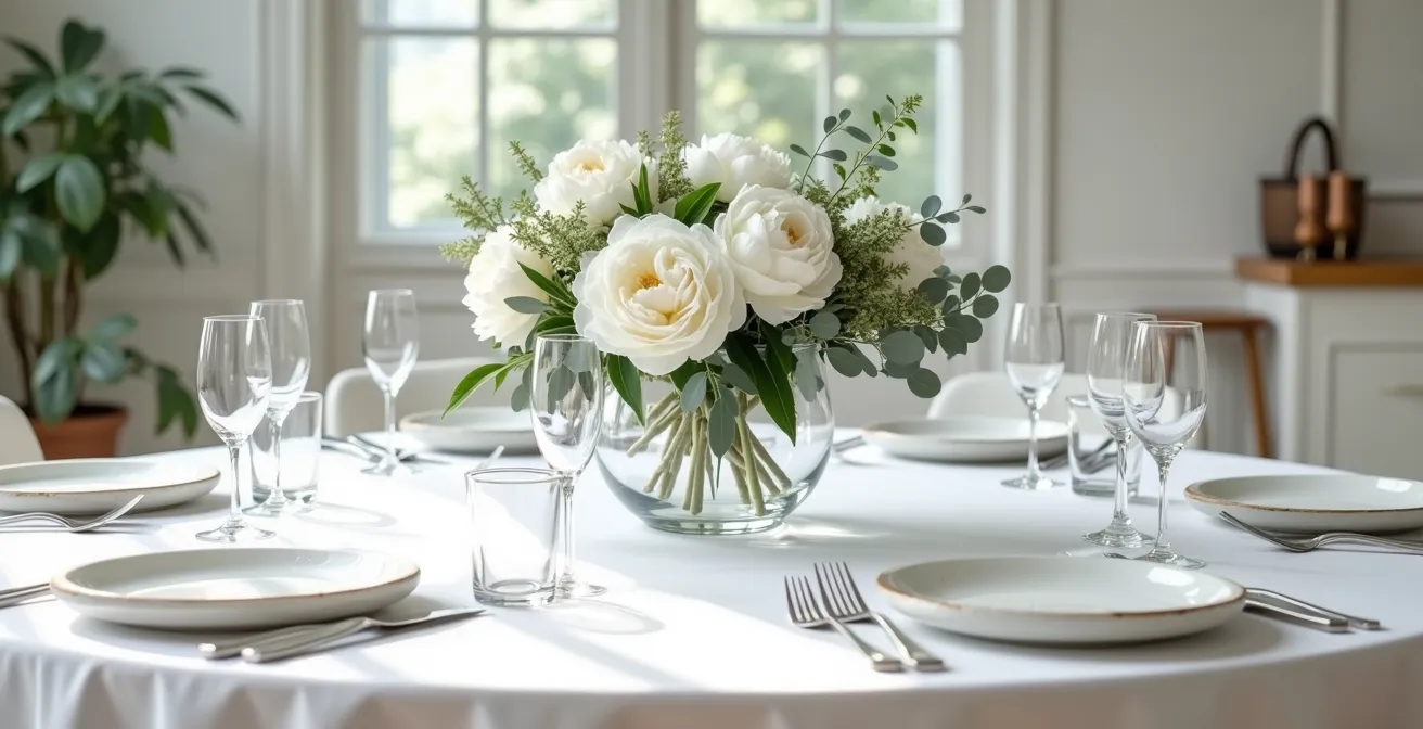 Le plus grand péché en art de la table n’est pas le mauvais goût, mais l’obstacle à la conversation. Sur une table ronde de 120 cm, conçue pour 4 à 6 personnes, l’espace central est précieux et la proximité, essentielle. La règle fondamentale n’est pas esthétique, elle est fonctionnelle : préserver la ligne de regard entre chaque convive. Oubliez les compositions hautes et spectaculaires qui forcent vos invités à jouer à cache-cache. L’objectif est un confort visuel total. Bien que certains experts en art de la table évoquent une règle selon laquelle la hauteur du vase doit correspondre à environ un tiers de la hauteur de la table, ce n’est qu’un point de départ. La véritable mesure est humaine.