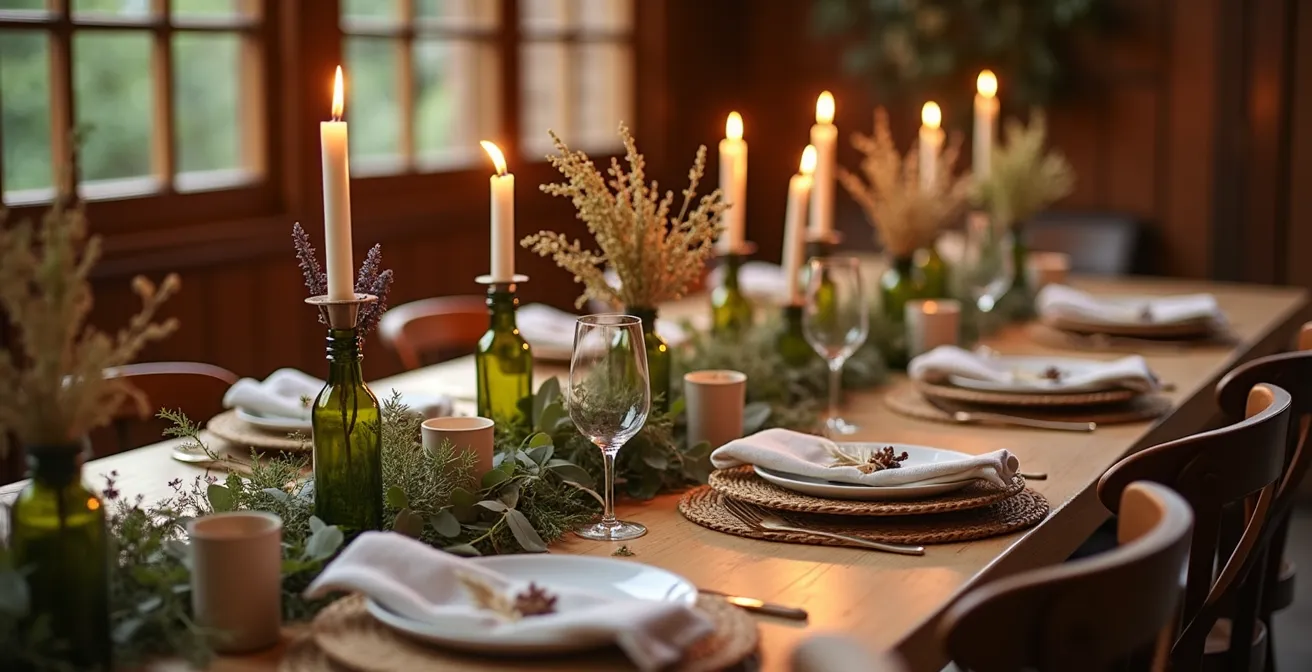 Cela ne signifie pas renoncer à l’impact visuel. Au lieu d’un seul bloc central, pensez en « chemin de table ». Créez une composition basse et allongée qui serpente entre les plats : une succession de petits photophores, de mini-vases avec une seule fleur, de feuillages posés à plat, de fruits de saison… Une autre option est de créer des « satellites » décoratifs, de petites compositions placées par groupe de 2 ou 3 convives. Cela libère le centre de la table pour les plats à partager et crée une expérience plus personnelle pour chaque invité.