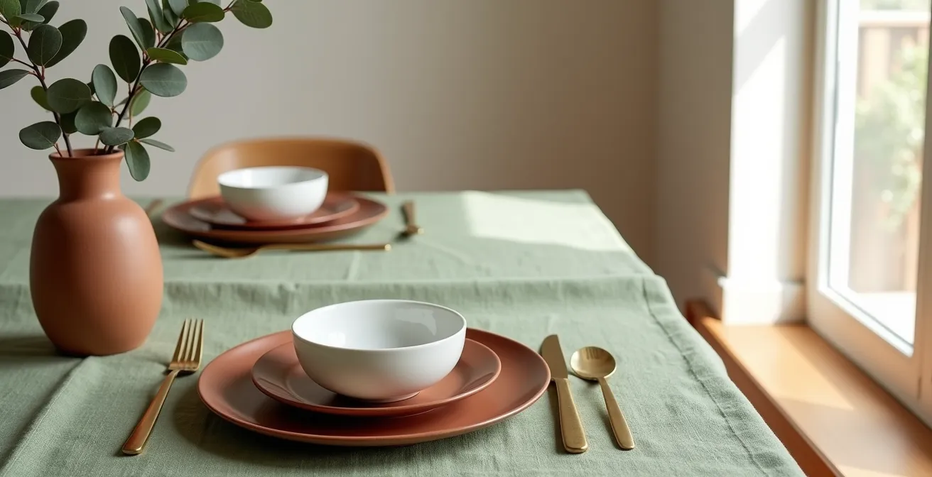 La transition ne nécessite pas de tout changer. Si votre base est une nappe neutre (blanche, beige, lin brut), il vous suffit de remplacer vos accessoires terracotta par des éléments vert sauge : serviettes, sets de table, bougies, ou encore un centre de table composé de feuillages frais. Si au contraire, votre pièce maîtresse est une nappe terracotta, jouez sur les contrastes en y disposant une vaisselle vert sauge ou des verres teintés de bleu. L’idée est une micro-évolution saisonnière, pas une révolution. Ce principe est d’autant plus vrai que, comme le rappellent les experts, le bleu est peu présent dans les aliments naturels, ce qui renforce son association psychologique avec l’eau et la fraîcheur.